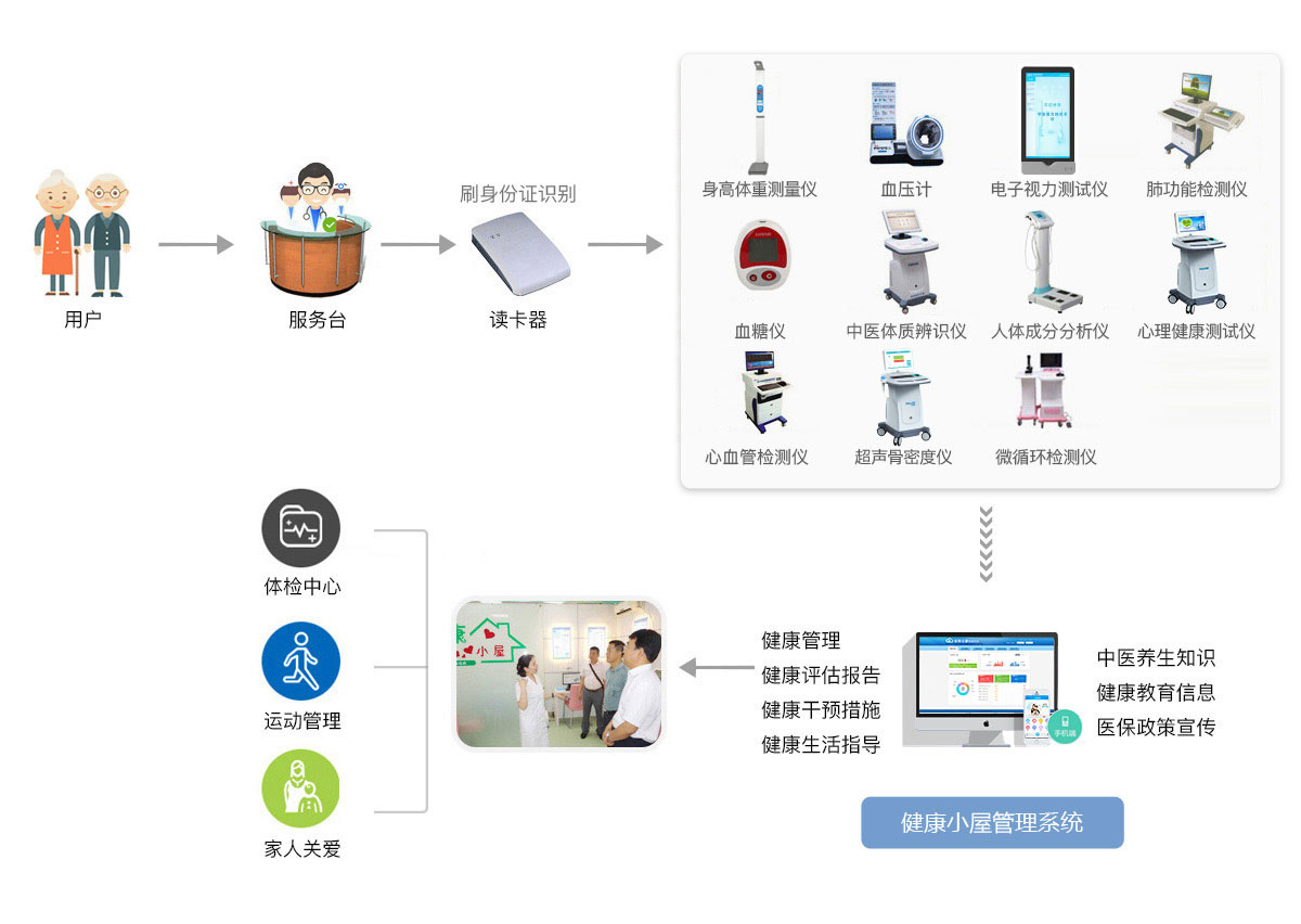 健康小屋系統(tǒng)是指通過軟件技術、物聯(lián)網、通訊技術,把多種專業(yè)級醫(yī)療健康設備整合在一個溫馨、舒適的環(huán)境下,使體檢者可以自主、輕松、愉快地選擇體檢項目,并實現(xiàn)一系列生理參數的檢測、自動評估、健康指導、健康宣教等功能。重在培養(yǎng)自我健康管理意識,樹立健康生活習慣。